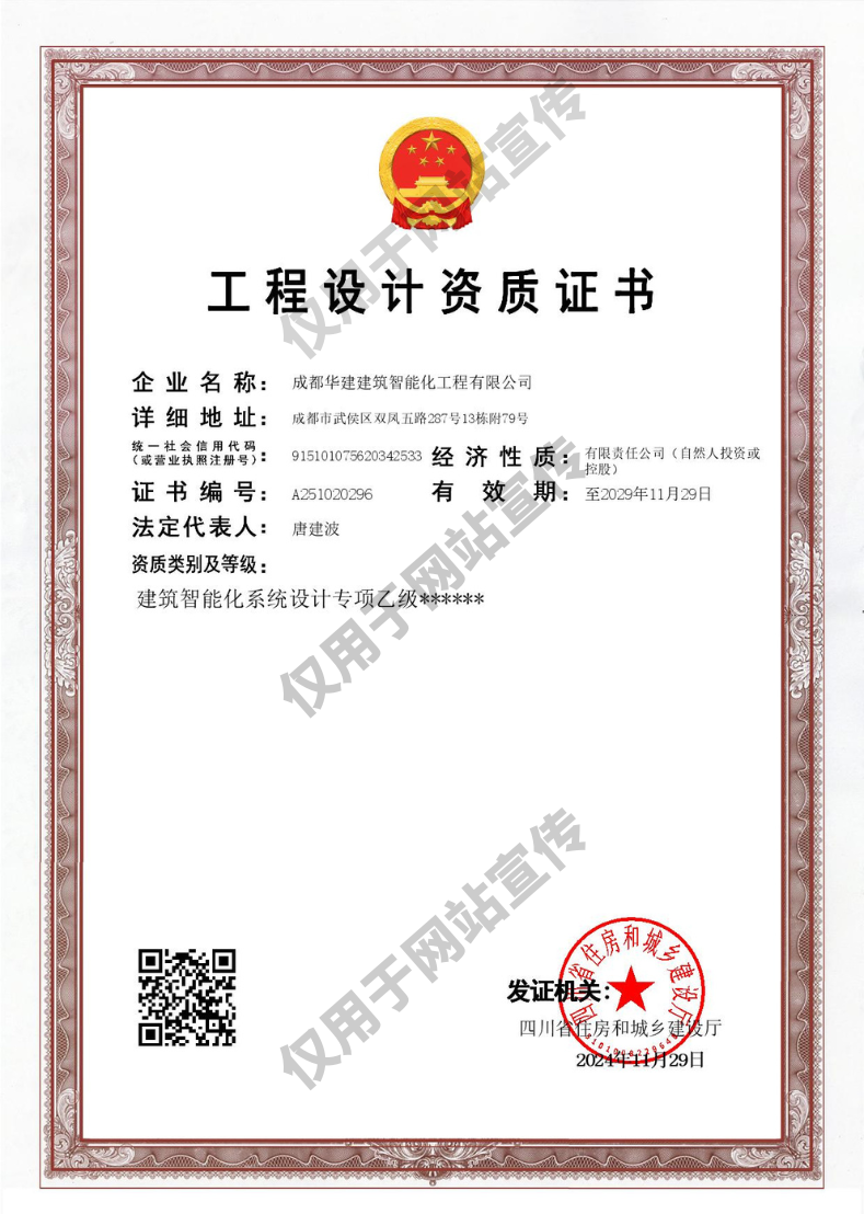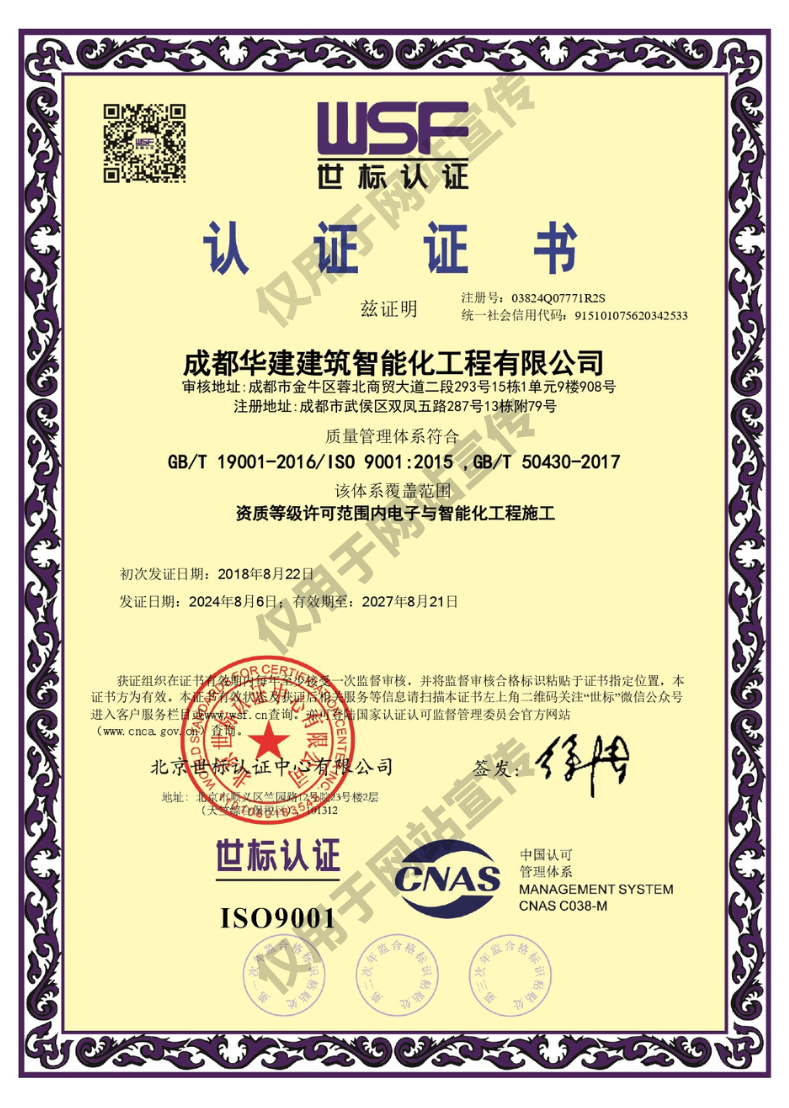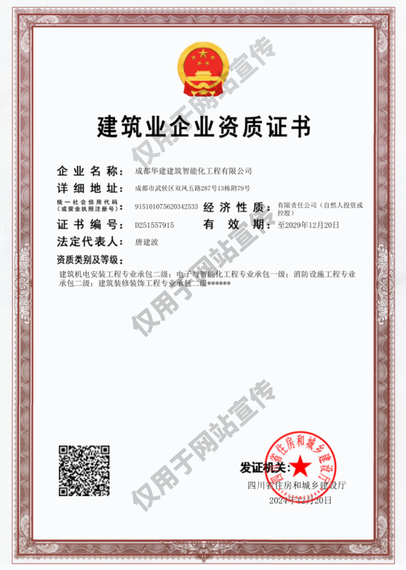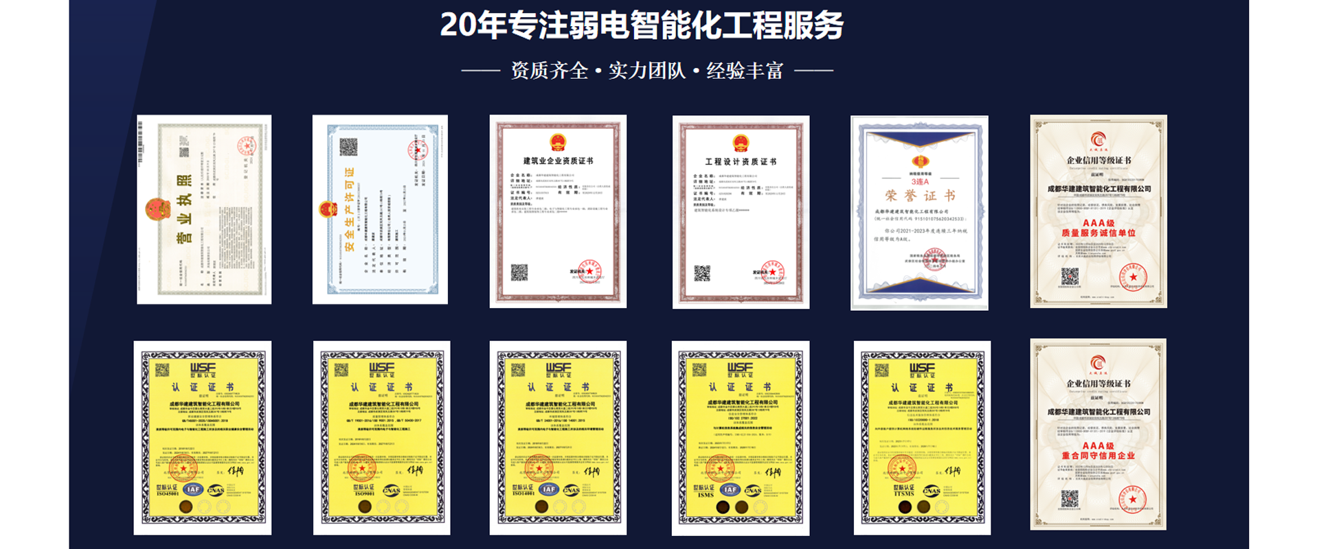 成都華建建筑智能化工程有限公司,19年專(zhuān)注弱電智能化工程、消防工程、建筑機(jī)電安裝工程的專(zhuān)業(yè)公司,具備電子與智能化工程、消防設(shè)施工程、建筑機(jī)電安裝、建筑裝修裝飾、建筑智能化設(shè)計(jì)等相關(guān)30余項(xiàng)資質(zhì)及證書(shū)。設(shè)計(jì)、施工和維保一站式服務(wù),多行業(yè)中大型成功交付案例。…